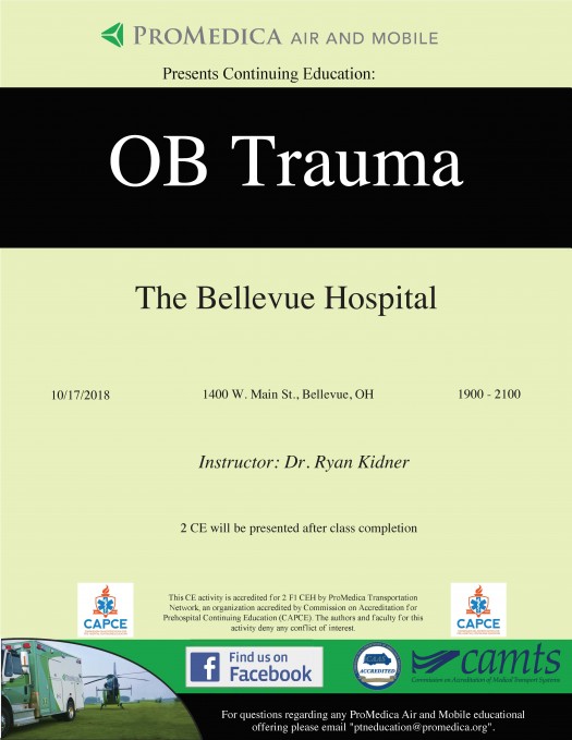 An "OB Trauma" Continuing Education Program will be presented Wednesday, Oct. 17 from 7:00 - 9:00 pm at The Bellevue Hospital in the Burson Conference Room. Two CE credits will be presented after class completion. Please see the attached flyer for additional information.