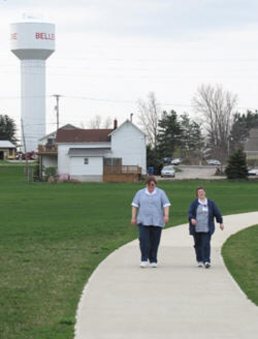 • Christa Pelyhes and Christine McGinn, employees in The Bellevue Hospital’s Environmental Services Department, take a lap around the hospital’s Wellness & Walking Path during National Start! Walking Day on Wednesday.