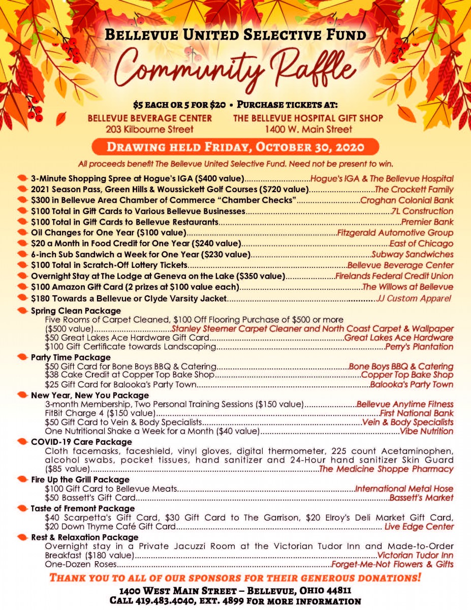 Tickets are available at the Bellevue Beverage Center, 203 Kilbourne St., Bellevue, or The Bellevue Hospital Gift Shop, 1400 W. Main St., Bellevue. The drawing will take place on Friday, Oct. 30 at Firelands Federal Credit Union in Bellevue. Winners need not be present to win.