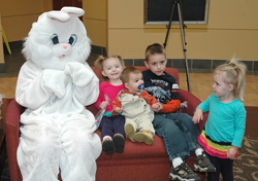 - Leighann Schaffer, 2, far right, keeps a safe distance despite that fact that her siblings are comfortable sitting next to the Easter Bunny! The others include, left to right, Kayli, 4; Aidan, 10 months; and Matthew, 6.