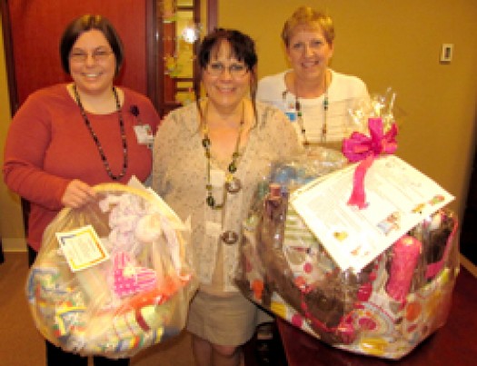 • Janet Runner, Vice President for Patient Care Services at The Bellevue Hospital, right, presents two of the baskets to Shannon Hansen, left, and Darlene Stewart.