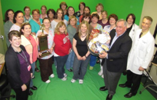 Kate Herring (front, left), director of TBH’s Foundation, and Michael K. Winthrop, President and CEO of TBH (front, right) presented the traveling trophy to: back row left to right, Becky Burroughs, Amanda Toft, Angela Mattox, Tina Clements, Theresa Dickman, Krista Bluhm. Second row, Melissa Friend, Barb Rohrbacher, Amy Thomas, Erica Chapin, Ashley Conner, Becky Sampsel, Kari Krupp. First row, Herring, Robbin Frantz, Cori Wright, Haley Peters, Lisa Barr, Karastin Rudolph, Benita Nichols, Cathy Chapman, Mary Vallance, Winthrop, Felicia Windnagel, CNP, Steven Benedict, MD.