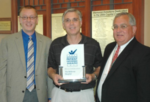 • Daniel Herring, D.O., Chief of Staff at The Bellevue Hospital; Mark Pifer, O.D., Hospital Board President; and Michael K. Winthrop, President and CEO, display the Outstanding Patient Experience Award for 2011 from HealthGrades.