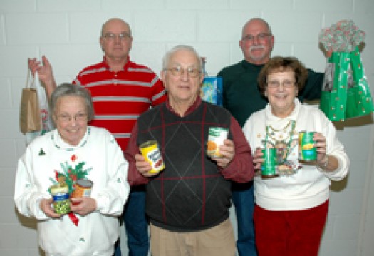 Hundreds of food items were collected along with $107 in cash at the Mature Audience Luncheon on Dec. 8, with everything being donated to the Bellevue Fish and Loaves Food Pantry. Packing up some of the food items were, front row left to right, luncheon participants Merry Lerch, Bob Kirsch and Jan Kirsch. In the back row are Roy Swartz and Larry Hay, representing Fish and Loaves.
