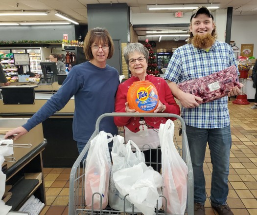On the morning of Dec. 12, Alice and her grandson Zach Adams maneuvered through the grocery store aisles to cash in on her winning raffle prize. Alice and Zach concentrated on several cuts of meats and seafood during their shopping spree and ended with a total of nearly $500 in grocery items. The cost of the prize was split between The Bellevue Hospital and Hogue’s IGA.