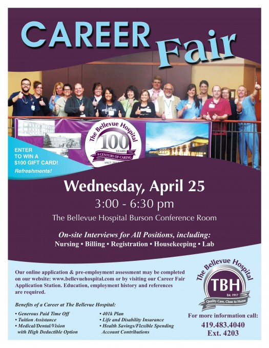 The Bellevue Hospital (TBH) will be hosting a Career Fair on Wednesday, April 25 from 3:00-6:30 p.m. in the hospital's Burson Conference Room.