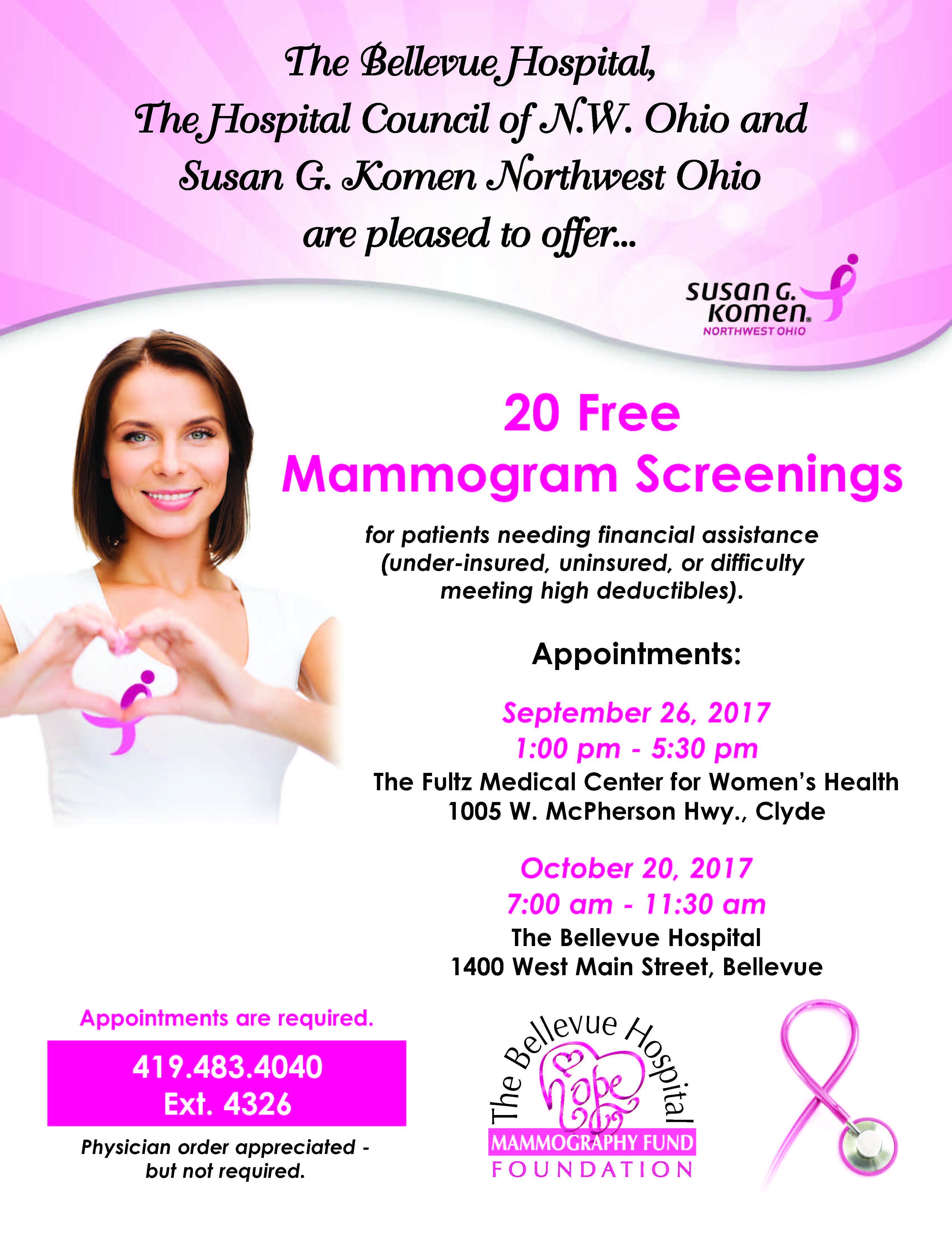 The Bellevue Hospital (TBH), The Hospital Council of Northwest Ohio, and the Northwest Ohio Affiliate of Susan G. Komen are teaming together to offer free screening mammograms for patients needing financial assistance (uninsured, under-insured or difficulty meeting high deductibles) in TBH’s...