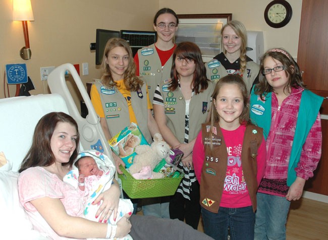 A tradition was carried out by local Girl Scouts on March 12, when several representatives presented a basket of goodies to the first girl born in The Bellevue Hospital's Family Birthing Center during National Girl Scout Week. Meah Uhrick, daughter of Bellevue's Taylor Bilton and Jay Uhrick, was...
