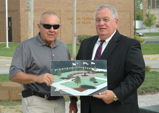 Kenn Rospert, left, representing the Firelands Federal Credit Union (FFCU), and Michael K. Winthrop, right, president and CEO of The Bellevue Hospital (TBH), display an artist’s rendering of the nearly completed Fallen Soldiers Memorial on the grounds of FFCU. TBH is one of the large corporate...