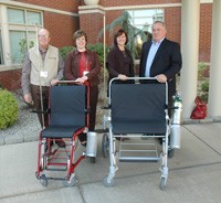 From left to right, Bob Beck, a volunteer at The Bellevue Hospital (TBH), Kate Herring, director of TBH’s Foundation, Jill Colizoli, vice president of TBH’s Auxiliary, and TBH President and CEO Michael K. Winthrop display two of the six new STAXI Medical Wheelchairs purchased by the Auxiliary and...